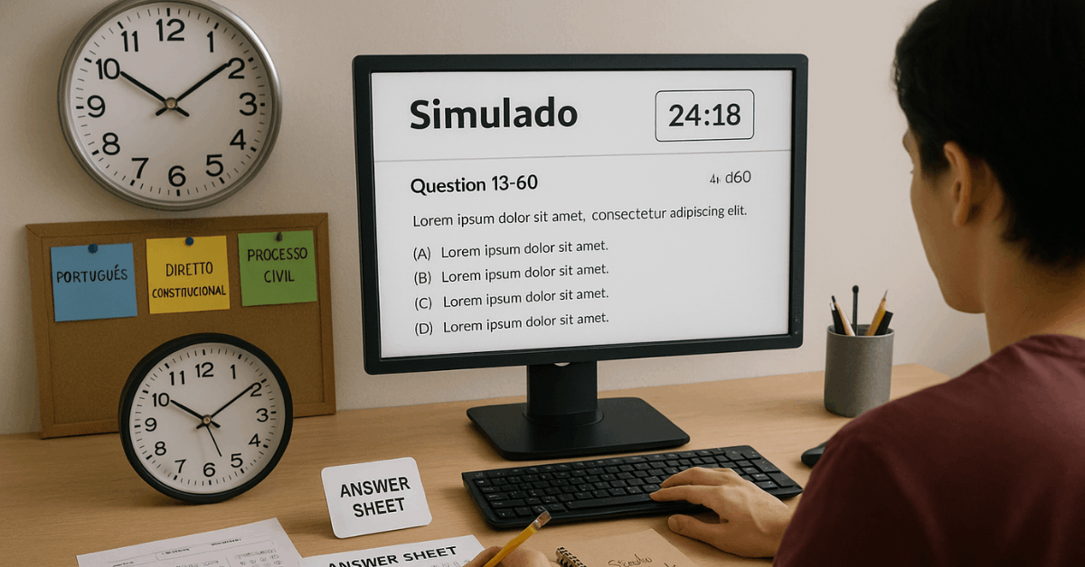 Resolva provas anteriores incansavelmente. Realize ao menos um simulado completo e cronometrado por semana para aprimorar velocidade e disciplina na hora do chute.